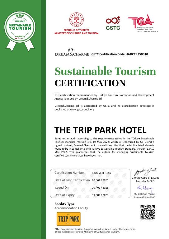 As THE TRIP PARK HOTEL, our Sustainability policy applies a sustainability management system that addresses environmental, social, cultural, economic, quality, human rights, health, security, risk and crisis management issues and continuous improvement.